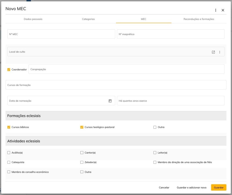 - Luogo di culto – qui deve essere selezionato il luogo di culto dove il MEC può esercitare la comunione;
